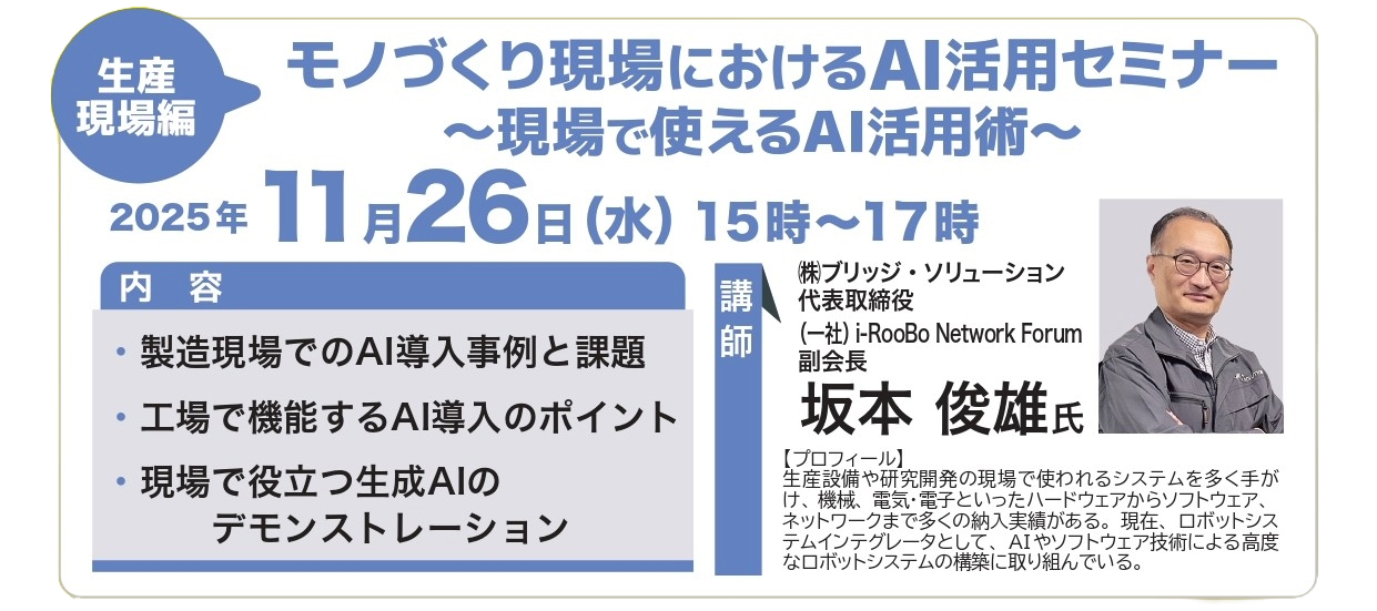 オフィス業務を省力化する生成AIやRPA・OCRの活用、製造現場でのAI活用について、導入のコツや効果などをデモを交えてわかりやすく解説する2つのセミナーを開催します。AIの導入を検討されている方はもちろん、すでに取り組みを始めている方にとっても、現場目線のヒントが得られる内容です。業務改善や生産性向上に向けた、第一歩としてぜひご参加ください。